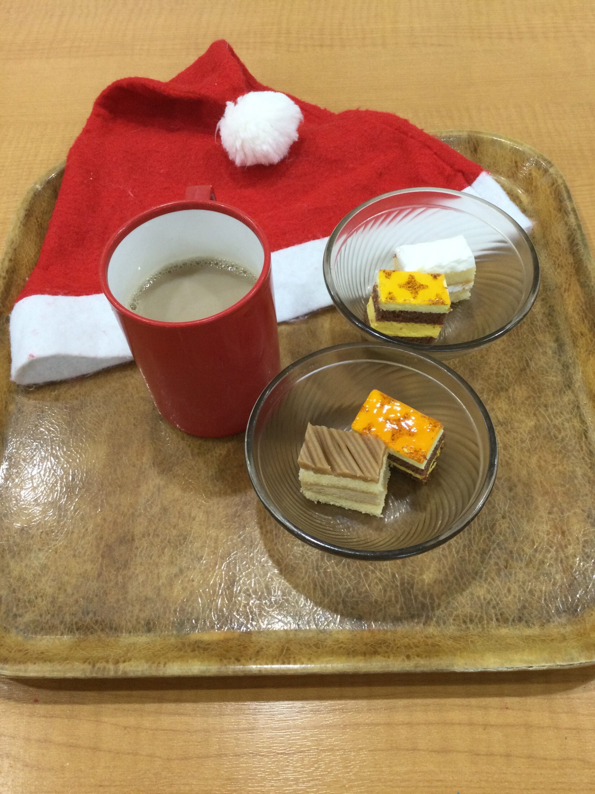 おやつにはミニケーキとジュースをクリスマスソングを聞きながら召し上がっていただきました。「すごく美味しかった。」「また食べたい!」などのお言葉をもらいました。