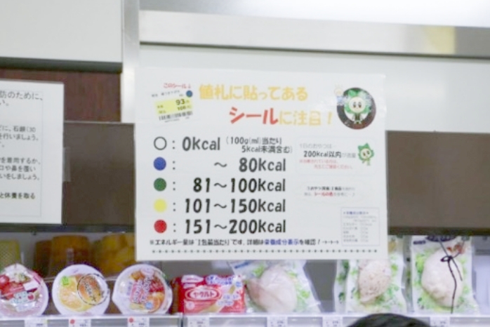 当店で販売している食品の値札にはカロリー量の目安となるカラーシールが貼られています。
