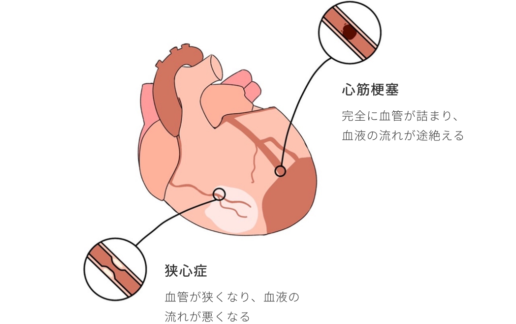 心臓の血管(冠動脈)が狭くなる、または詰まってしまうことによって起きる病気のことで、多くの場合、胸の圧迫感と表現される胸痛を生じます。一時的に心臓の筋肉への血流が不足しその後回復とともに症状が改善するものが狭心症、血流が途絶え、心臓の筋肉が壊死を起こすものが心筋梗塞です。高コレステロール血症、高血圧症、糖尿病、喫煙習慣などを有する方に起きやすいことが知られています。虚血性心疾患の診断は、心電図、心エコー図、冠動脈CT、心臓核医学検査、心臓カテーテル法等の様々な方法を組み合わせることが多く、治療についても、薬物療法、心臓カテーテル治療、外科手術があり、病状に適した治療が選択されます。