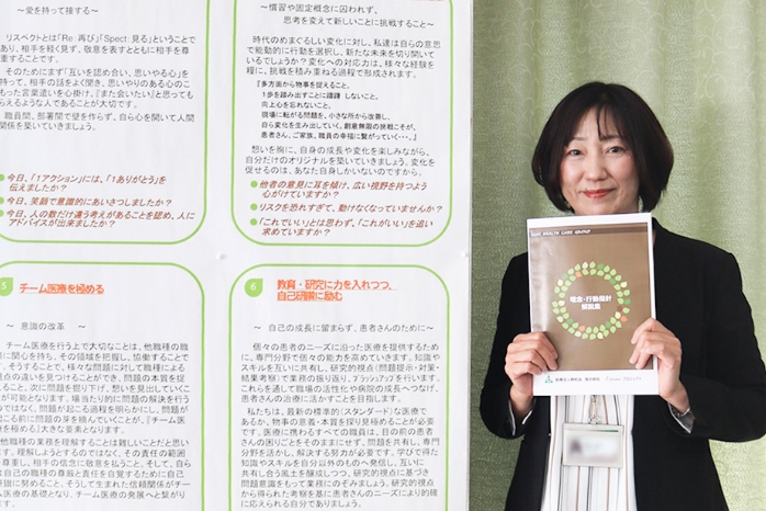 以前、70人くらいの職員が関わるプロジェクトを作り、話し合いを重ね、わかりやすい言葉で綴ったのが「私たちの7つの行動指針」です。まずは理事長等の経営層の方々で、理念やビジョンを決めた後、職員も参加して進めました。内容を記した冊子までプロジェクトで発刊し、入職時に配布しています。当法人では医師も含めて人事評価制度を取り入れていますが、そのベースにもなっています。